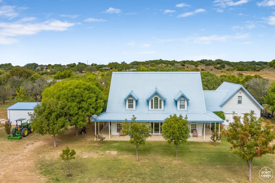 Spacious custom built 4/3.5 two story home on 6.24 acres giving plenty of room to roam and have a few animals and garden. The home is all metal construction with wrap around porches to sit and enjoy the view and peace of the countryside. The master bedroom suite is downstairs and features a jetted garden tub, oversize shower, and private outdoor entrance off the porch. Also located in the downstairs is a dining room, living room, office, laundry room, and large kitchen with plenty of cabinet space and breakfast area seating. Flooring in the home is tile in most areas with carpet in the upstairs bedrooms, gameroom, and upstairs living area. Other amenities in the home include oak cabinets, granite, ceiling fans throughout, and plenty of closet space. Large windows throughout the home allow natural lighting. In the back of the house there is a nice rock patio area for outdoor living, cooking, and relaxing under the shade of the many trees. The land has great cover with several varieties of trees and native brush. The home offers over 4000 square feet of living area in the privacy of the country yet convenient to town.