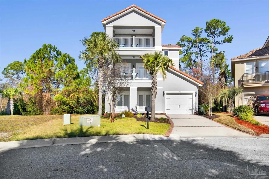 Welcome to 7955 Double Gate Drive, ideally situated in the fabulous Arborgate community at Perdido Key. This exceptional property offers versatility as a primary residence or a second home for memorable family getaways and has been used exclusively as a vacation home, never rented. The 4 bedroom / 3.5 bath Spanish-style residence features a well-appointed kitchen with granite countertops, stainless steel appliances, and tile flooring throughout the main level. Additional upgrades include an epoxy-coated garage floor, Wi-Fi controlled thermostats, and a security alarm system with cameras for added convenience and peace of mind. The spacious primary suite, located on the second floor, offers an en-suite bath and a covered balcony-ideal for relaxing and enjoying the coastal atmosphere. The third level includes two additional bedrooms, each with a private bath, along with another covered balcony for additional outdoor living space. Outdoor features include a newly sodded yard with Wi-Fi controlled Rain-Bird irrigation system and a charming back deck complete with an outdoor shower, perfect after a day at the beach. Residents of Arborgate enjoy access to a community pool and is just a short distance to bike trails and public beach access, making this home an outstanding opportunity to experience the best of Perdido Key living.