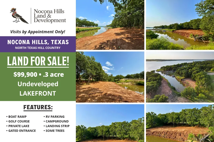 .3 acre lakefront property! Located on a deep channel on Lake Nocona. Launch your own boat after you build the type of dock you want. No build time requirement on any structure. Minimum structure of 1,200 sq.ft for any home. Enjoy easy access to breath-taking sunset views and due so all year-round! Top 5 fishing lakes for bass, in Texas! Very historic Hill Country surrounding. HOA, $1200 annually for improved. 24.7 manned Gate! Co-op Water & Electric! High speed Internet! Airstrip! 18 hole golf course. Community access to the boat ramp and dock to Lake Nocona. 15min to shop essentials. 2 hours to DFW. Very desired-type Lake front & very hard to find!