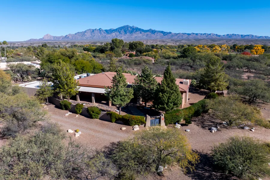 Welcome to this impeccably maintained home located in the beautiful and tranquil Tubac Country Club Estates. From the moment you arrive, you are greeted by a charming gated courtyard and welcoming entryway that set the tone for the comfort and quality found throughout the home. Step inside to an open and spacious living room featuring high ceilings with striking overhead beams, recessed lighting, and large neutral tile floors that create a bright and airy atmosphere. A cozy fireplace anchors the space, while a sunken bar adds a perfect spot for entertaining and gathering with friends and family. The open kitchen is both functional and inviting, highlighted by a large picture window over the sink that frames serene views of the patio and surrounding mountains, allowing natural light and nature to flow in. The kitchen boasts gorgeous granite countertops, a large butcher block island ideal for meal prep or casual dining, and a generous pantry providing ample storage. Adjacent to the kitchen, the dining area sits comfortably between the kitchen and great room, accented by a beautiful chandelier and offering an ideal space to enjoy everyday meals or special occasions.