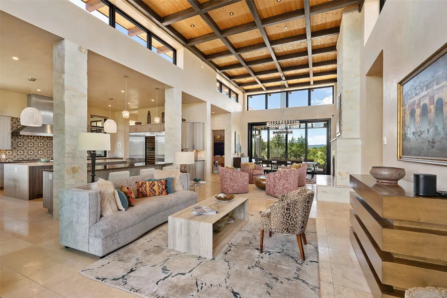 CONTEMPORARY MASTERPIECE IN LAS CAMPANAS WITH UNPARALLELED VIEWS TO BOTH MOUNTAIN RANGES. Bordering Bureau of Land Management Land, this exceptional property offers sweeping Eastern and Western Mountain vistas with uncompromised privacy. The 3,947 sqft main home has plenty of natural light, towering wood and steel ceilings and clerestory windows - designed by noted architect Lorn Tryk and executed by Prull Custom Builders - featuring 1 bedroom, 2 offices, a media room, and gallery-like spaces enhanced by travertine floors, warm stacked-stone masonry walls, custom ironwork, and motorized shades. The Owner's suite looks to the landscape and is a haven of tranquility. A detached guest house provides 2 bedrooms, 2 bathrooms, and a kitchenette - perfect for extended stays of hosting in style. Smart-home systems, a whole-home natural gas generator, and a 3-car garage with an oversized truck bay ensure convenience and peace of mind. Designed for modern living, the chef's kitchen includes Wolf and Sub-Zero appliances, dual dishwashers & ovens, steam oven, large wine fridge, pantry, and striking Spanish woven-metal light fixtures. Outdoor living is extraordinary with patios accessible from nearly every room, 3 fountains, hot tub with outdoor shower, and a custom Agave mural by artist Pam Platt. Four fireplaces add warmth and ambience indoors and out. Phenomenal cross-lighting, gorgeous driveway approach, and refined details throughout complete this contemporary retreat in one of Santa Fe's most prestigious communities.