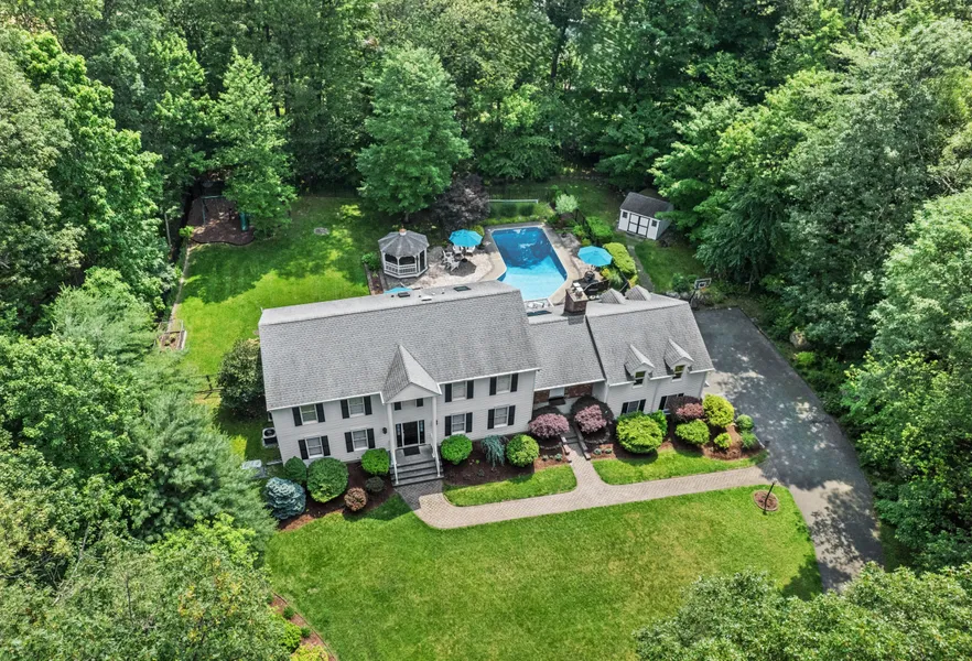 Amazing cul-de-sac location with 1.43 acres of flat property. Classic center hall colonial privately set with backyard oasis. Inground heated pool, paver patio, deck, screened gazebo, mature landscaping with beautiful perennial plantings, fenced yard and storage shed. Many updates inside and out. Natural gas generator, multi-zone baseboard heating, 2 central air units. Wood floors, granite, crown moldings, recessed lighting, skylights, transom and palladium windows, French doors, Viking and Sub-Zero appliances, too much too list! First level is complete with entry foyer, living room, dining room, eat-in kitchen with separate dining area, full bath, office/bedroom, den with gas fireplace and family room with high ceilings. Second level features primary suite with primary bath and walk-in closet. Primary bath with shower stall, soaking tub and double sink vanity. Three additional bedrooms and main bath complete the second level. Finished basement having recreation room, craft room, large storage room, utility room and access to garage on grade level. Minutes to major highways, shopping and restaurants yet privately tucked away in great neighborhood. Continued top rated school system.