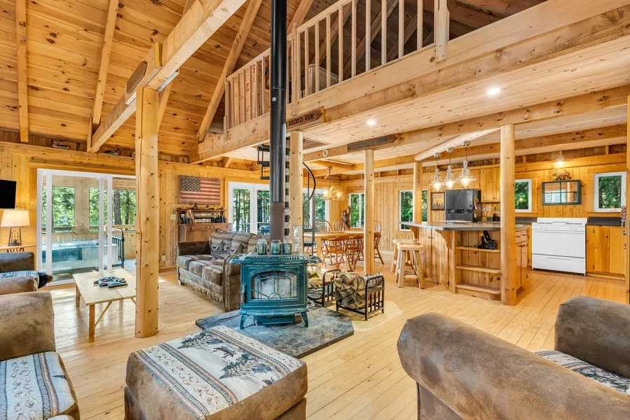 Built in 2004, The Great Lodge has modern amenities including the kitchen with stove, refrigerator, and water heater, all powered by propane. An open-concept design, the building offers hardwood floors, handcrafted cabinets and center island, pantry, large dining area, comfortable living room, newer Waterford ceramic wood stove, a bedroom on the sunporch, and a master bedroom up the spiral staircase in the loft. The oversized deck and expansive staircase encourage outdoor living and is a guest favorite. Enjoy the sunsets from the deck with the westerly views.