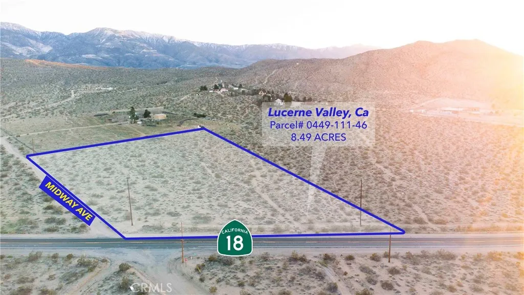 Location! location! location! 8,49 Acres of the land, Use Code is residential- vacant Land. Located on corner of Hwy 18 and Midway Ave. The subject property is in the Desert Region within the Lucerne Valley Community. Also price-wise in addition, a very meaningful price was set it was put on the market at a price more than five times lower than the price of land on the same HWY 18 just 0.4 miles away. Residents in the area have private water wells or water tanks for their water needs, propane tanks for their solar or gas needs, and septic tanks for their sewer needs. And approximately 30 minutes from Big Bear and Big Bear Lake. located in Southern California's High Desert region, is a picturesque and tranquil community nestled amidst the vast expanse of the Mojave Desert. This charming town is renowned for its stunning natural beauty, with the towering San Gabriel Mountains to the south and the expansive Mojave National Preserve to the north. WE WILL REVIEW ANY OFFERS!! THE SELLER IS MOTIVATED FOR SALE.