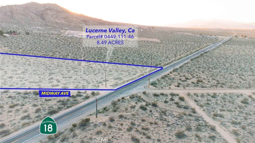 Location! location! location! 8,49 Acres of the land, Use Code is residential- vacant Land. Located on corner of Hwy 18 and Midway Ave. The subject property is in the Desert Region within the Lucerne Valley Community. Also price-wise in addition, a very meaningful price was set it was put on the market at a price more than five times lower than the price of land on the same HWY 18 just 0.4 miles away. Residents in the area have private water wells or water tanks for their water needs, propane tanks for their solar or gas needs, and septic tanks for their sewer needs. And approximately 30 minutes from Big Bear and Big Bear Lake. located in Southern California's High Desert region, is a picturesque and tranquil community nestled amidst the vast expanse of the Mojave Desert. This charming town is renowned for its stunning natural beauty, with the towering San Gabriel Mountains to the south and the expansive Mojave National Preserve to the north. WE WILL REVIEW ANY OFFERS!! THE SELLER IS MOTIVATED FOR SALE.