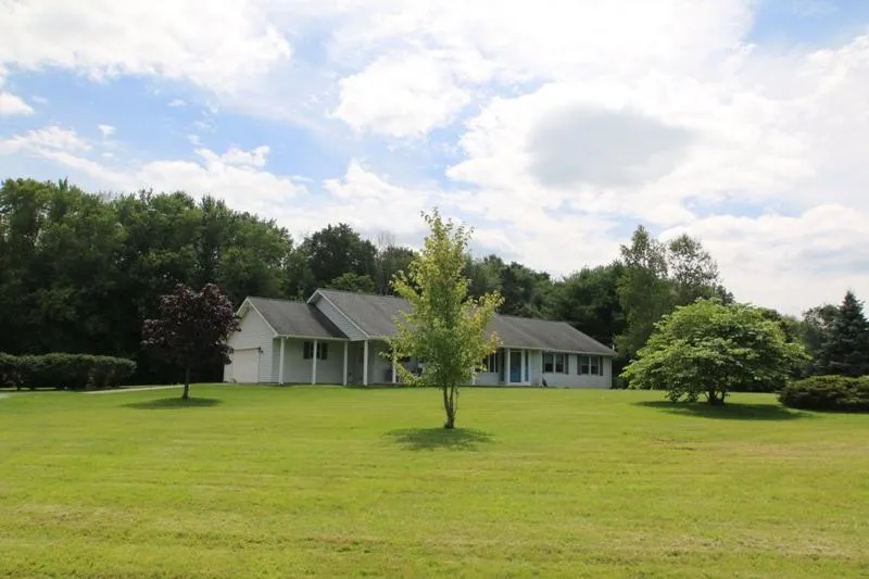 NEW PRICE--This wonderful ranch home sits 520' off the road on 8.64 acres of beautiful land consisting of 4.5 acres of mature woods, green grass, pasture & pond. The two barns (40'X60' & 25'X33') offer separate electric, water, horse stalls, corral--perfect for horses, 4-H projects, hobbies, & shop! The home features a spacious open floor plan w/living room & great room off kitchen w/ double sided wood-burning fireplace. The great room feels like a sun room w/3 walls of windows overlooking back yard, woods, & deck. Dave Fox remodeled kitchen (2003) features cherry cabinets, granite counters, double sided breakfast bar. Updates include: Interior remodel 2003; roof 2004; heat pump & furnace 2009; dishwasher 2014. Recreation room and office in lower level. Delco water serves the home. Seller is ready to relocate and wants an offer!!