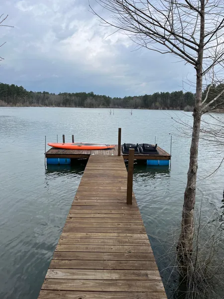 This property is made up of a mix of hardwoods and mature pines. It boasts a 35 acre (25 acres residing on the property) spring fed fully stocked lake ready to fish. There are multiple fingers coming off of the lake with the potential to build a cabin on. It has a great road system that is clean and very easy to navigate. There is a brand new utility/ work shed on site as well as a covered area connected to a boat dock on the edge of the lake. While traversing the property there were ample deer and turkey sign.