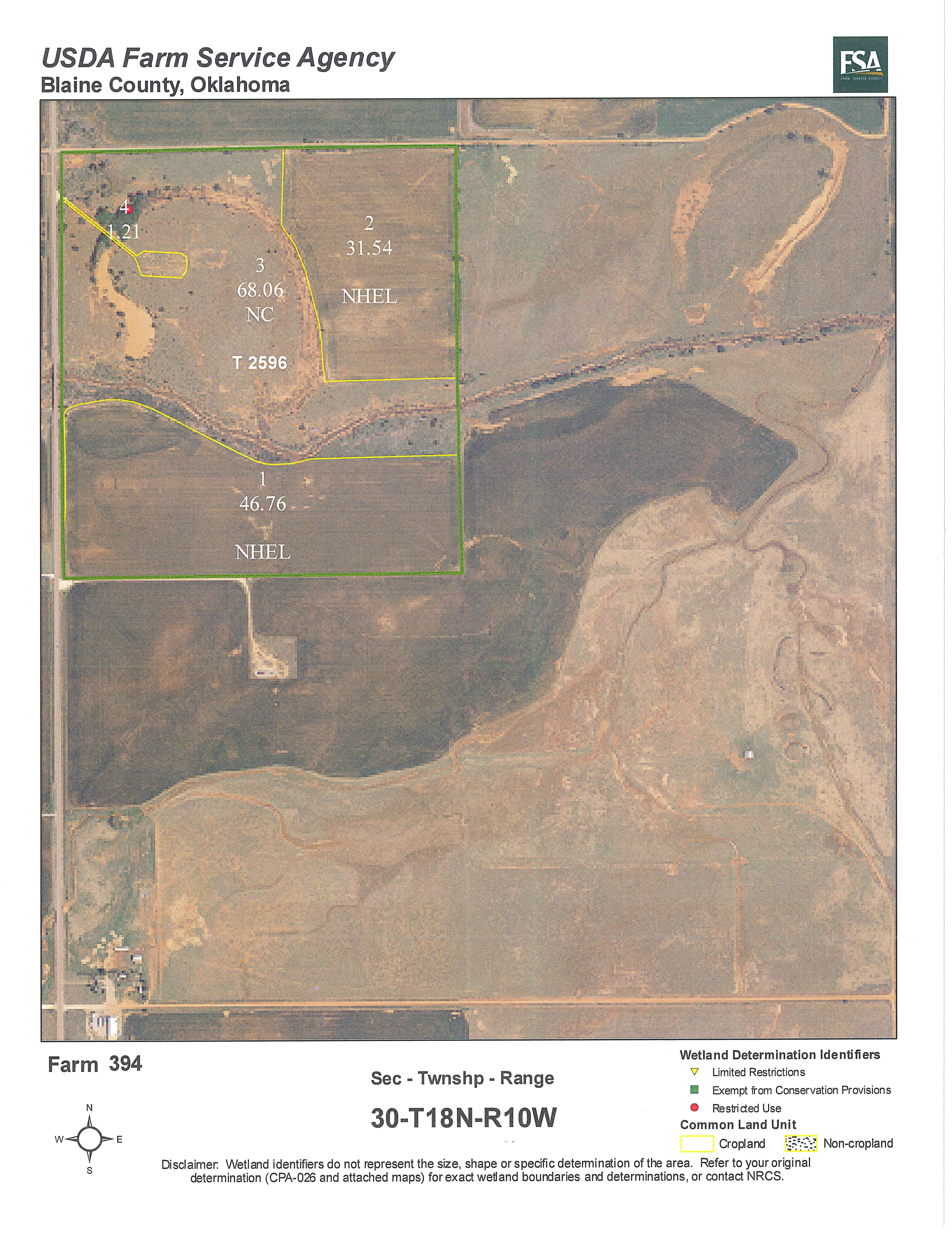 This 160 +/- acres is located 7 miles south of Okeene on SH 8. According to the Blaine County FSA this farm has approx. 78.3 acres of cropland with a 77.5 acre wheat base, and 26 bushel per acre yield. Principle soil types of the cultivated land are McLain silty clay loam, 0-1% slopes, Class I & Port loam, 0-1% slopes, Class II. These soils lay level and are easily tilled. The balance of the farm is comprised of good grass pasture, pond, scattered timber, and approx. ½ mile Salt Creek which has plentiful water. In addition, this land is fenced and cross fenced and has rural water across the road west. If you are in the market for a good small grain/cattle farm, be sure to take a look. Legal Description: The NW/4 of Sec. 30, Twp. 18 N., R10 W.I.M., Blaine Co., OK. Crop: Does not sell. Taxes: The 2010 taxes were approx. $513.80 and will be paid by the Seller. The 2011 & any future taxes are to be paid by the Buyer. Minerals: Will be offered separately from the surface. Possession: Possession is to be given upon completion of the harvest of the presently growing 2010-2011 wheat crop or July 31, 2011, whichever is later. Cash Lease Payment: The cash lease payment in the amount of $2,000.00 due and payable in the month of January, 2011 will transfer to the Buyer.