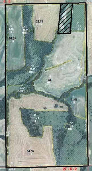 This farm, 160 acres, more or less, consists of approximately 19 acres bottomland cropland, 121 acres upland cropland, 9 acres waterways, and 7 acres creek and timber. The bottomland is all Hobbs soils and the upland is mostly Crete and Geary soils. Access to the field in the southeast corner is from the south, up Kiowa Road.