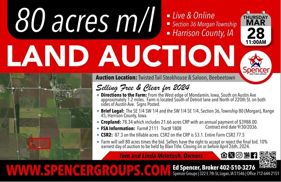 Brief Legal: The SE 1/4 SW 1/4 and the SW 1/4 SE 1/4, Section 36, Township 80 (Morgan), Range 45, Harrison County, Iowa.
