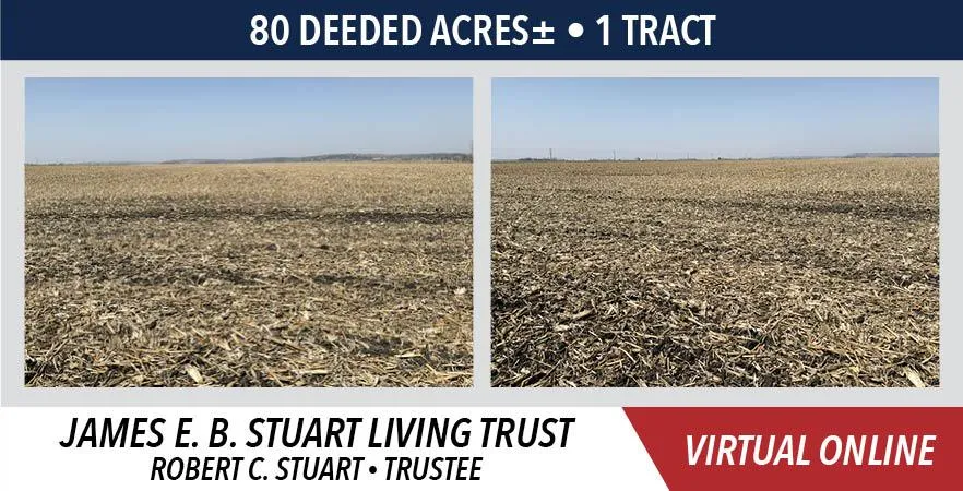 The Stuart Farm will be sold in 1 tract on a price per acre basis based on the deeded and advertised acres. Immediately following the auction, the successful buyer(s) will be required to sign a real estate sales contract and pay ten percent (10%) of the purchase price as a non-refundable down payment which will be held in escrow until closing. The balance of the purchase price will be due at closing in approximately 30 days on or about July 28, 2025 upon delivery of a merchantable abstract and Trustee Warranty Deed. The Real Estate Taxes will be prorated to the date of closing. Possession will be given at the time of closing subject to a lease with the current tenant for the 2025 farming season. Buyer will receive 50% of the cash rent as a credit at the time of closing. (Ask auction company for details.)