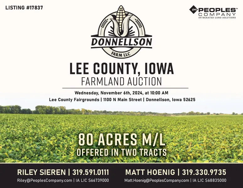 Lee County, Iowa Land Auction Save the date! Join us on Wednesday, November 6th, 2024, at 10:00 AM for a LIVE Auction with a simultaneous online bidding option at the Lee County Fairgrounds in Donnellson, IA. Peoples Company is proud to represent Donnellson Farm, LLC in the auction of 80 acres m/l of prime farmland located just northwest of Donnellson, Iowa. The 80 acres will be offered in two tracts via buyer's choice auction method. Dont miss your chance to invest in this exceptional farm.
