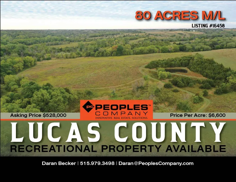 Peoples Company is pleased to bring to the market a top-notch recreational property with CRP income. This property has been kept up and is in turn-key condition with mowed paths to access tower blinds, pine growths for bedding, tall grass CRP for upland birds, hardwood creek bottom for mature bucks to cruise during the rut, and a stocked pond for those non-hunting days. Located just 3/4 of a mile off the hard surface road and only a few short miles to Highway 65, this farm is the perfect location to build your dream home with easy access to Des Moines or Chariton. The 80 acres m/l consists of 31.72 acres of CRP paying $153.71 per acre or $4,876 annually. These CRP acres in CP25 will allow for 10% of the FSA fields to be used for food plots. Food plots will have to be approved and mapped out with the FSA/NRCS office in Lucas County. Rural Water is close and Electric is at the road. The gate is locked to access the farm please call the listing agent for any showings.