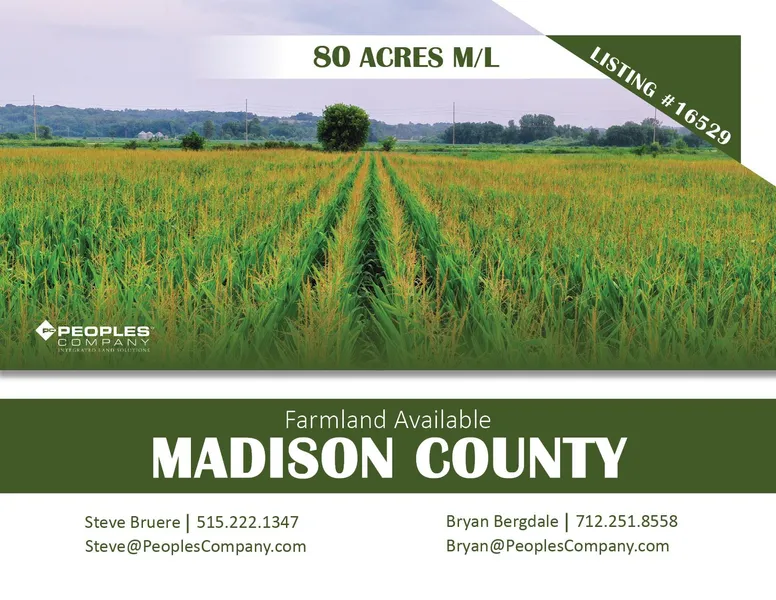 Peoples Company is pleased to offer 80 acres m/l of Madison County farmland located less than 1/4 mile off of Highway 92 and less than 20 minutes from West Des Moines. The property includes 70.25 tillable acres m/l with an average CSR2 rating of 44.5. Primary soils include Wabash silty clay loam and Colo silty clay loam. Over the past two years, the property has undergone significant improvements including tree clearing, drainage tile installation work, surface ditching, and new oversized field entrances allowing for larger farm equipment. Approximately 74,237 feet of drainage tile was installed in the Fall of 2020 enhancing drainage and farmability. From a fertility standpoint, the farm had chicken litter applied for the 2021 and 2022 crops. The 2022 farm tenant has been terminated but would be happy to negotiate an agreement for 2023.