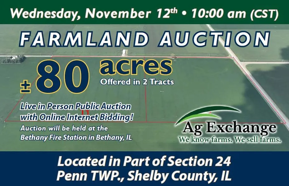+/- 80 Acres located in the N of the NE of section 24, T14N R3E Penn Twp. Shelby County, IL.