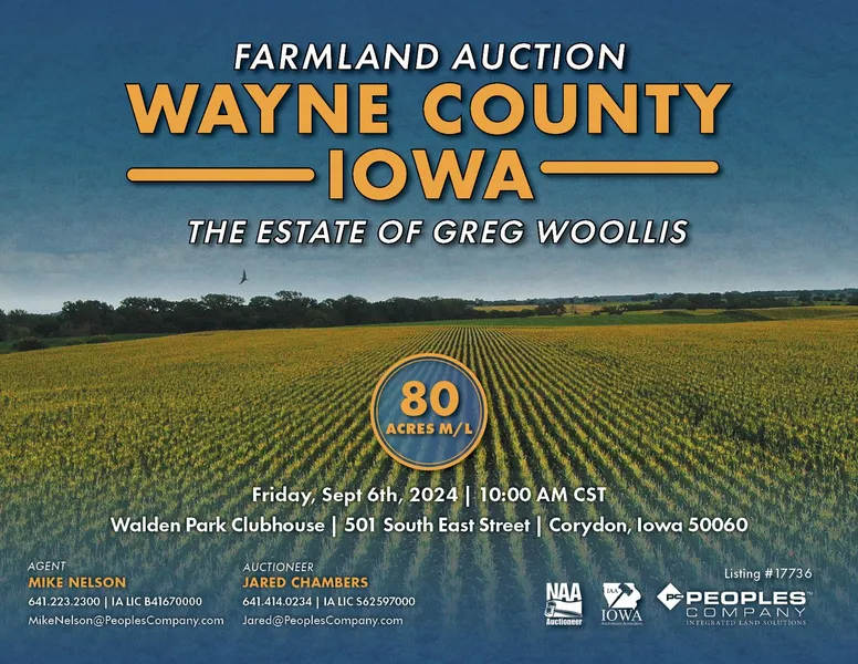 Wayne County, Iowa Farmland Auction - Mark your calendar for Friday, Sept 6th, 2024, at 10:00 AM CST! Peoples Company is pleased to be representing The Estate of Greg Woollis in the sale of 80 acres m/l of highly tillable farmland in Wayne County, Iowa.