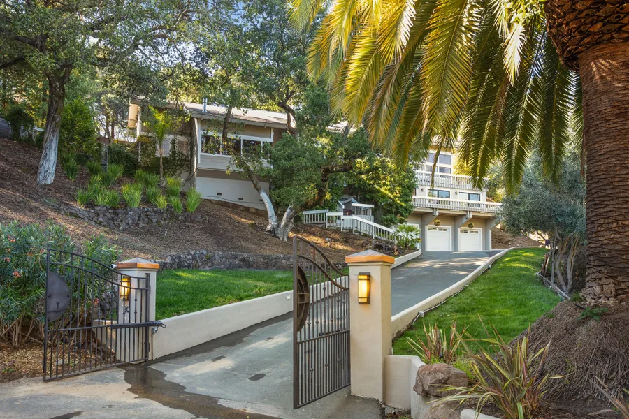 Undoubtedly one of the most sought-after locations in Marin Country Club lies this rare, private, gated estate on over an acre with a taste of wine country living in Marin. Situated above the 2nd Fairway, this home provides an indoor/outdoor retreat complete with pool, sauna, Malbec vineyard, and beautiful gardens. This truly special 4 Bedroom / 3 Bathroom, multi-level home boasts a grand scale living room with vaulted wood ceilings and Onyx fireplace, and formal dining room with French doors. The open concept great room offers a spacious kitchen with island, dining nook, and family room with fireplace. Located off the family room is the media/bonus room with outdoor access, guest bath and an optional office. The main level primary suite features a walk-in closet and luxurious marble bath. Upstairs is that versatile bonus space that everyone is longing for these days, an ideal home office/loft. Three guest bedrooms, all with outdoor access, remodeled guest bath, and large laundry room with built-in storage are found downstairs.