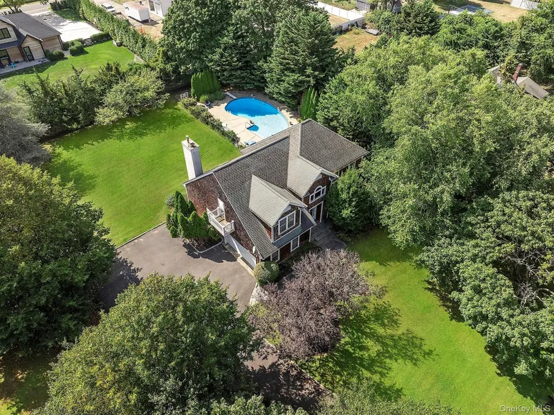 Located in a quiet and private setting, this well-maintained home sits on 0.87 acres and offers 4 bedrooms, 2.5 bathrooms, and approximately 2,400 square feet of interior space plus a finished lower level. The first floor features an open kitchen with stainless steel appliances and a breakfast area with sliding doors leading to the back deck. Additional first-level spaces include a formal dining room, living room with fireplace and wet bar, and a powder room. Upstairs, the primary suite includes a walk-in closet, en suite bathroom, and private balcony. Three additional bedrooms, a full hall bathroom, and a large landing with room for sitting, complete the second level. The backyard includes an in-ground pool, expansive lawn, and plenty of room for outdoor living and entertaining. Located in the East Moriches School District with choice of three high schools: Westhampton Beach, Center Moriches, and Eastport South Manor. Schedule your private showing of 80 Moriches Avenue now!