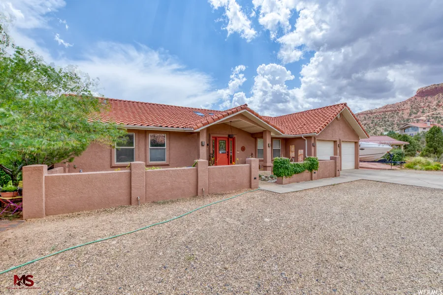 This 4 bedroom home boasts stunning, unobstructed 360 views of the Vermillion Cliffs, Kaibab Plateau and the city of Kanab. There is a new roof that comes with a 5 year, warranty & new hot water heater. The house sits on a corner lot being 2.4 acres in the quiet Ranchos subdivision, only one mile to the center of town. Gorgeous indoor and outdoor living in this 3,750 sf home Large windows throughout to take advantage of the views as well as passive solar during the winter months. Expansive master bedroom on main floor features a gas fireplace, large walk-in closet and full bath with claw foot tub and tile shower. Downstairs features a family room and two bedrooms with Jack and Jill bath. There is also a large shop area with utility sink and two storage rooms. Backyard area is fully landscaped and includes fish pond. In addition , there is a separate 384 sf casita which has been used as pottery studio, has a toilet and Utility sink, which could easily be replaced with vanity and is pre plumbed for shower. Make this into your guest house. New hot tub on the Trex decking covered by a Pergola. Paved access around the lot to add another unit on the west side. Garage!