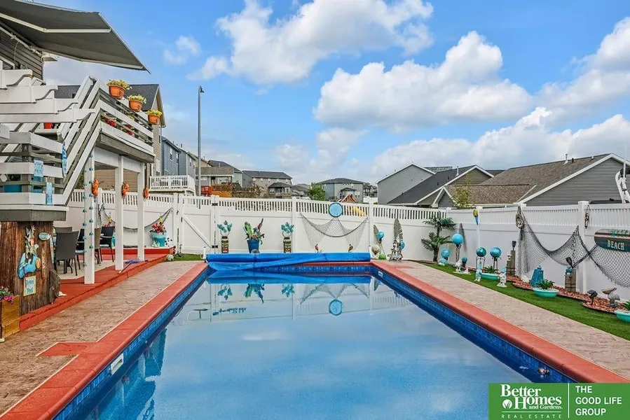 PRE-INSPECTED! Beach bungalow vibes! This home is like NO other in Majestic Pointe! This large scale ranch boasts a stunning 14x38 SALTWATER POOL surrounded by stamped & stained concrete, a turf backyard for no upkeep, & an outdoor oasis w/pergola, tiki bar, covered lower deck, motorized awning covers upper deck. Inside, enjoy cathedral ceilings, LVP flooring throughout, updated lighting, & an extended kitchen with custom cabinets, oversized island, gorgeous tile backsplash, beer/wine fridge, all appliances included. Perfect set up for multigenerational living, the finished walkout basement offers a second kitchen with electric cooktop, full fridge, soft-close cabinets, massive storage, & a huge 4th bedroom with walk-in closet. Extra concrete pad off the front porch, tinted south/west windows, corner lot, meticulous landscaping, electric fireplace, all blinds stay, & garbage service included in the HOA. New roof! A truly unique property. Chairlift inc. Buyer to verify schools. AMA.