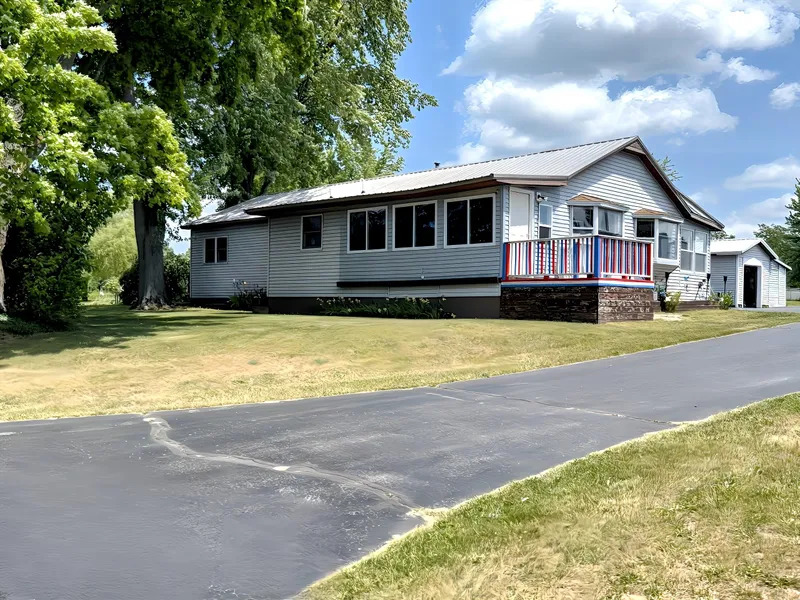 Five percent down financing available. Looking for peace, privacy, and room to breathe? This 3-bedroom, 2-bath home sits on 4.5 acres and offers thoughtful details that make everyday life easier and more enjoyable. The home features a solid metal roof, paved driveway, and multiple outbuildings including a heated garage workshop, a cozy finished shed, and RV or boat storage with drive-through access. Enjoy mornings on the three-season porch, cook in the outdoor kitchen, and unwind beneath the producing grape arbor. A dedicated 5th-wheel parking slab with hookups and a whole-house Generac generator add comfort and reliability. This property is ideal for those seeking space to live, work, and relax. Cash or portfolio loan required due to year built.