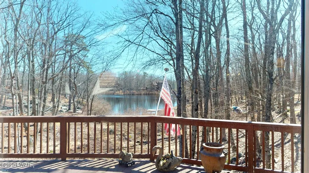 Fabulous Water Views! Centrally located in Hemlock Farms. Enjoy the great view of the water in this pond front home while relaxing and gazing out the window from the open living room, dining room and kitchen. Or step outside onto the open deck and enjoy the fresh outdoors, if you want to get out of the sun relax or have on the large screen porch or have a mewl there. This 4-bedroom 2 bath home features a stone fireplace in the living room, hardwood floors, family room, Ductless A/C. Come see this home to appreciate all it has to offer