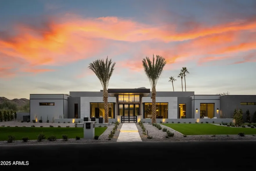 Brand-new modern home by Patterson Homes. Experience over 8,000 square feet of thoughtfully designed living space. The moment you enter, you will be struck by the abundant natural light and the open layout that highlights panoramic views of Mummy Mountain. At the heart of the home, the main living area seamlessly connects to a beautiful kitchen featuring Miele appliances, a spacious eat-in island, and plenty of storage - making it perfect for both daily living and entertaining. A true split layout ensures maximum privacy, with the lavish primary suite tucked away in its own wing. Here, you'll find a showstopping bathroom and a generously sized closet complete with its own washer and dryer. On the other side of the home, the guest wing includes four ensuite bedrooms, an oversized laundry room, and a large flex space - complete with a full bar and pass-through window overlooking the resort-style pool, creating the ideal spot for gatherings. Rounding out the impressive features is an oversized 4-car garage with 12' ceilings and side-mount openers, easily accommodating up to 8 cars with lifts. Beyond the main residence, a 654-square-foot casita and a spacious pool cabana, complete with an outdoor kitchen, offer even more room to spread out and enjoy the Arizona lifestyle. Easy to show!