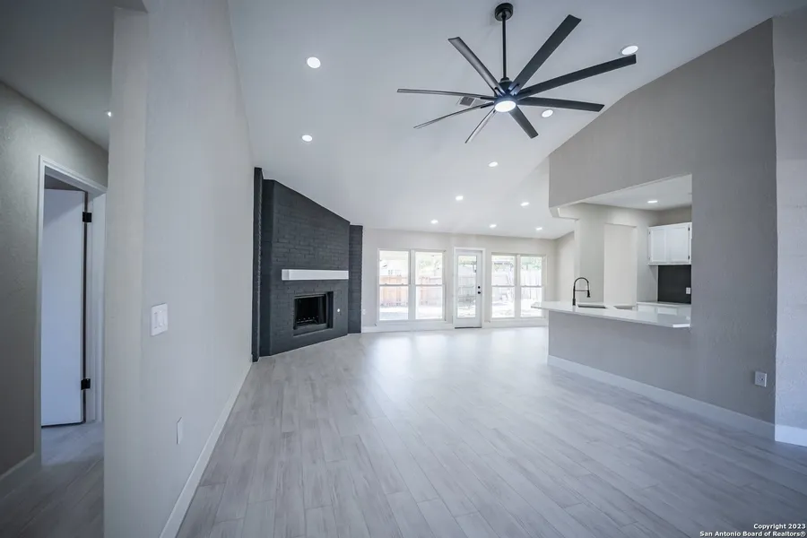 This stunning 4 bedroom 2 full bath home was brilliantly crafter under 1,904 square feet and will surely leave you in awe. Approaching the residence you'll find a extended covered patio with black brick, a white trim and a clean grey exterior. Making your way through the front door you're immediately greeted with an exceptionally pleasing open floor plan. The home features wood plank porcelain tile with white wall base moldings, recessed lighting, towering ceilings and is complete with fresh neutral paint.