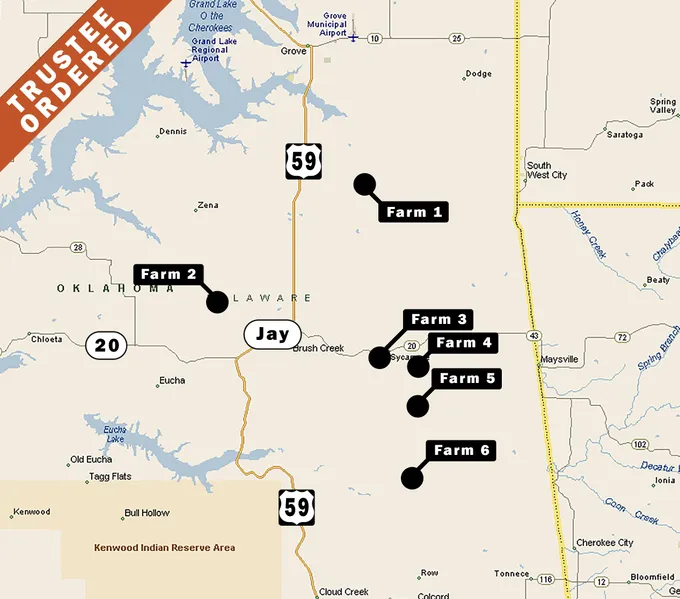 Located in Delaware county along the Hwy 59 corridor from Grove to Jay, the 6 farms offer a variety of parcels that include improved pastures, recreational land, home-sites and homes. Auction includes historic Sycamore Spring which is located on Farm 4, parcel 7.