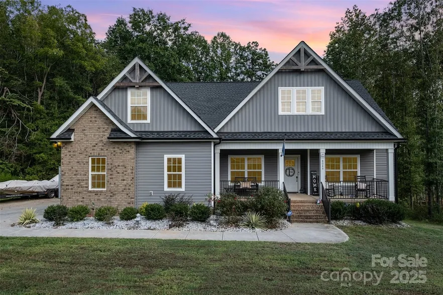 Tucked away in a quiet cul-de-sac, this beautiful home sits on a generous 1.21-acre lot in the highly desirable Sanders Landing community part of the top-ranked Clover School District. Designed with comfort and style in mind, the home features a spacious primary suite on the main level, an open floor plan with a cozy fireplace, and elegant coffered ceilings in the living area. Enjoy peaceful wooded views from your screened-in porch, perfect for morning coffee or evening relaxation. Luxury touches abound, including luxury vinyl plank flooring, quartz countertops, and a tankless water heater for energy efficiency. A variety of unique ceiling designs add character throughout the home. Upstairs, you'll find a private bedroom with a full bath ideal for guests as well as a large media room perfect for movie nights, a home office, or play space. If you re looking for privacy, space, and modern finishes in one of Clover s best communities this is the one!
