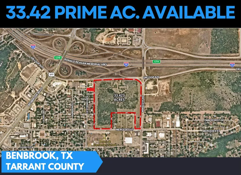 33.42 PRIME ACRES IN A VERY HIGH TRAFFIC AREA SITUATED ON THE SOUTHWEST CORNER OF INTERSTATE 820 AND WINSCOTT RD IN BENBROOK CITY LIMITS. Property offers over 3,200 feet of road frontage with access on all 4 sides. Property is situated on a hilltop with easy ON and OFF exit ramps via Interstate 820 as well as the Winscott crossover bridge. Property is currently under Ag Exemption and zoned commercial by the city of Benbrook. Property offers a undeveloped level building terrain in a very high visibility location to host a variety of endeavors. This is the first time this property has been offered for sale in over 80 years!