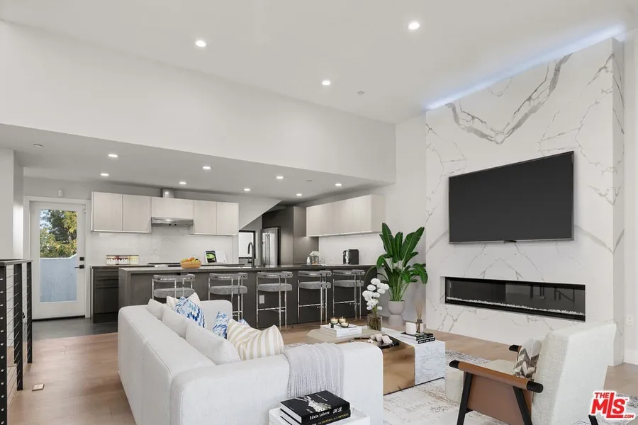 Welcome to the The Detroit Collection, an intimate assemblage of 4 architectural Single-Family Homes. This beautiful front facing home is equipped with high-end designer finishes, hardwood flooring, marble fireplace, and abundant natural light throughout. The incredible cook's kitchen features German-Import Leicht Cabinetry, huge eat-in breakfast bar, room for a large wine fridge or built-in pantry and dumbwaiter. The kitchen opens to a separate dining area and spacious living room with large windows - perfect for soaking up the SoCal sun and mountain views. Incredible open spaces and volume - designed meticulously to entertain on a grand scale. Enjoy dining al fresco on the private rooftop deck & enjoy the incredible 360 views of the city. Huge laundry room and storage area. A symphony of style this new to market modern masterpiece is an unparalleled experience.
