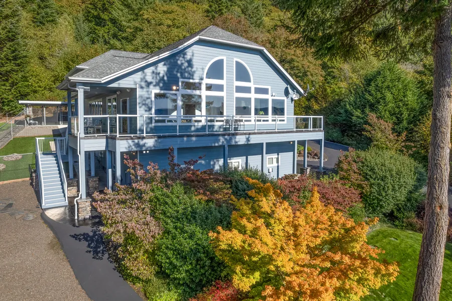 Compelling new price for an exclusive opportunity to own this amazing luxury hillside estate, overlooking the Columbia River to the Coastal Range in Oregon. Enjoy this secluded, secure, sophisticated property with stunning miles of Columbia River views. This high-tech custom tri-level 2006 estate is set on 5+ acres in the quiet, gated forest community of Maple Ridge Estates. Awaiting you are high end finishes, manicured landscaping, fabulous views from each room, stamped concrete wrap-around patios/decking, and a tiled sauna, all maintained with meticulous care. Telecommute with high-speed Internet from the dual-station home office with network center. Pursue your hobbies in one of the garages/shops or two workout rooms, all inside one big artistic home. Escape to this upscale retreat overlooking friendly, safe Wahkiakum County just 27 miles from I-5 and 62 miles from Portland.