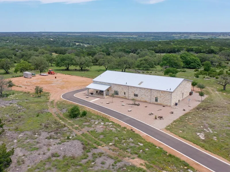 Enter through the imposing gated rock entry and into the finest community in the Hill Country. Once there you can just kick-back and enjoy the peace and serenity of this exclusive 81.4-acre recreational ranch. Placed high up on a ridge, the terrain is gently sloping with groomed areas dotted with enormous Live Oaks and Elms and, pockets of virgin wildlife habitat. Placed in the center of the property is an impressive 6,000 square foot rock and metal building, insulated and on a cement slab. The building is 24 feet in height, with 16 eaves and 12 foot doors, to accommodate almost any RV or farm equipment. There are both a 1,300 square foot living quarters, with a living area, kitchen, master bedroom/bath and covered porch, and a 704 square foot guest quarters. Both apartments are fully finished out with the same quality and amenities you would expect in a fine custom home.