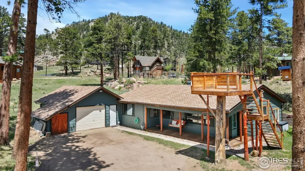 Surrounded by breathtaking scenery and just minutes from Rocky Mountain National Park and downtown Estes Park, this year-round mountain retreat is a dream come true for those seeking mountain serenity with modern comforts. Wake up to picture-perfect views of Long's Peak and Twin Sisters, where every sunrise and sunset feels like a postcard-worthy moment. The home has received numerous updates including fresh exterior and interior paint, blending rustic charm with a polished, updated look. The open and sunlit living space features warm Knotty Pine accents and a stunning moss rock fireplace, an inviting spot to unwind after a day of adventure. The recently remodeled kitchen is equipped with newer appliances, tiled backsplash, and live edge countertops, perfect for preparing meals and entertaining guests, with easy access to the dining area and living room. The garage has been thoughtfully transformed into a recreational space, offering flexibility for games, hobbies, or simply relaxing with friends and family. Outside, embrace the beauty of the great outdoors on your own raised observation platform. This unique feature allows you to experience nature up close, where wildlife sightings are a regular occurrence, and the tranquil surroundings can be enjoyed in peace. Additionally, the flagstone patio offers another vantage point to delight in the captivating views that envelop the property. Artisan fairy steps and a new water feature add to the character and charm of the outdoor living space. Whether hosting a barbecue, enjoying morning coffee, or enjoying the breathtaking scenery as you soak in the hot tub, this patio serves as a constant reminder of the enchanting Colorado lifestyle. The 100-year-old stone potato cellar adds a unique, historic aspect to the land, and the detached shed is the perfect spot for creative hobbies or storing your gear.