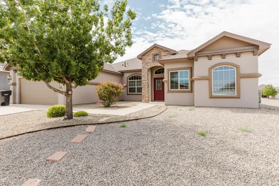 Plenty of space in this home, located on a corner lot! This home has an open concept living, kitchen and dining as well as a split bedroom floor plan! Four bedrooms and 3 full bathrooms, plus a flex/office space offer room to spread out! Enjoy desert evenings on the covered patio and backyard, that backs up to the neighborhood green space!