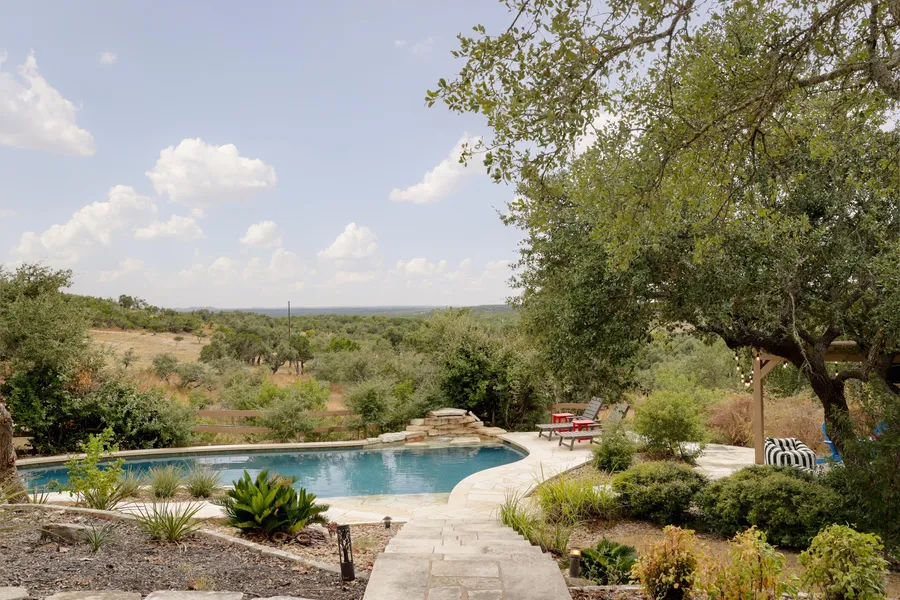 Perfectly located between the charming towns of Wimberley and Dripping Springs, this exceptional estate seamlessly blends luxury, privacy, and convenience and is ideal for entertaining or just relaxing and taking in the sweeping hill country views and vibrant sunsets. The custom home was designed to take full advantage of the breathtaking long-range vistas beyond Devil's Backbone and highlights a gourmet kitchen with an expansive center island, large walk-in pantry and a dining area framed by floor-to-ceiling windows and doors leading to the covered porch and outdoor dining area. The primary suite serves as a secluded retreat with ample privacy, and the home also includes a dedicated laundry room/mudroom with abundant storage, along with a cozy office nook. Outdoor living is a dream with an oversized salt-water pool, perfect for summer relaxation, and a pergola-shaded lounging and grill area with a custom off-set smoker. In addition to the spacious main residence, the acreage features a newly constructed 960 sq ft, 2-bedroom, 1-bath guest house/barn flanked by massive oak trees and featuring a custom fire pit area, providing options for guests, extended family, or a short-term rental opportunity. The property is also fenced and cross-fenced with separate storage buildings and areas for livestock, creating a serene environment for entertainment, relaxation and hobbies. With downtown Austin less than 45 minutes away and a Wildlife Exemption offering significant tax savings, this property strikes the perfect balance between urban accessibility, wealth creation and rural tranquilitythis is the ultimate Hill Country retreat.
