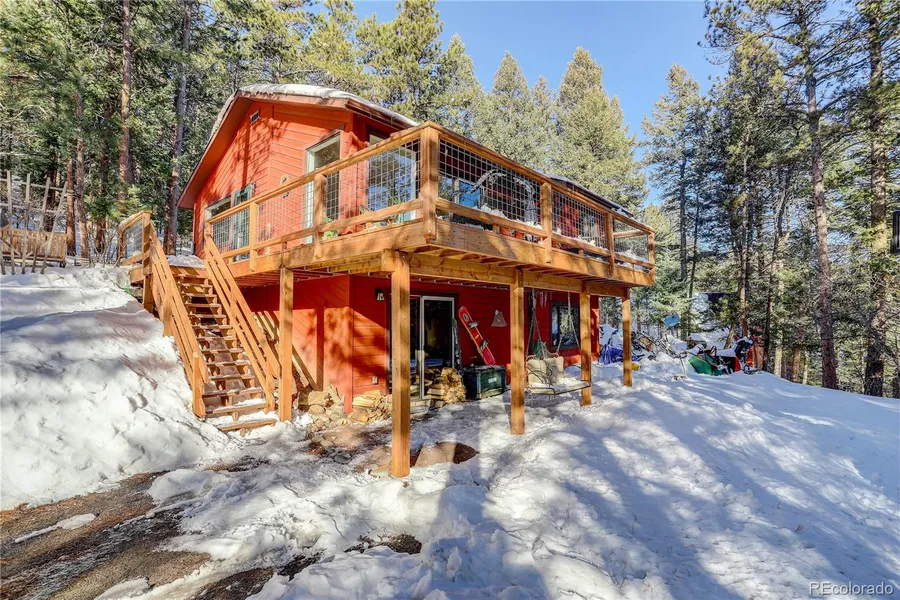 Enjoy mountain living in a cozy cabin. Set in the pines, with lots of privacy, this 3 bedroom, 2 bath home creates the feeling of living in a treehouse. The large windows make it will be easy to appreciate the sun filled open floor plan - the kitchen with stainless appliances, dining area and living room have wood floors and views to the forest. The wood burning stove keeps the room warm. Step out to the deck and enjoy the mountain air and surrounding evergreens. Step out the front door to a great patio area. Also, on the main floor, two bedrooms and an updated bath. Downstairs enjoy gathering in the family room for conversation or TV or walk out to the 1.25 acre lot. A spacious bright, sunny master bedroom with walk-in closet and bath offer a restful retreat. A laundry room with storage and storage under the stairs complete the lower level. This secluded cabin gives you the feeling you're the only one on the mountain. With an easy commute to Denver or the mountains, this mountain hideaway just waiting for you!
