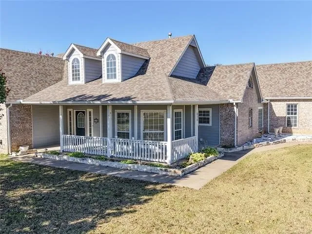 The living room brings in natural light with a wall of windows looking out to the covered deck and fenced backyard. The hot tub is there when the weather cooperates, and the in-ground storm shelter and generator-ready setup add extra peace of mind.