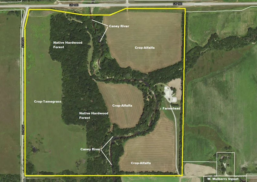 Nestled in the valley of the Big Caney River in the Kansas Flint Hills, this property is both beautiful and historic. Native Americans are known to have camped here regularly for thousands of years. Nearby Grenola was the largest single cattle shipping point in the US in the 1880's.