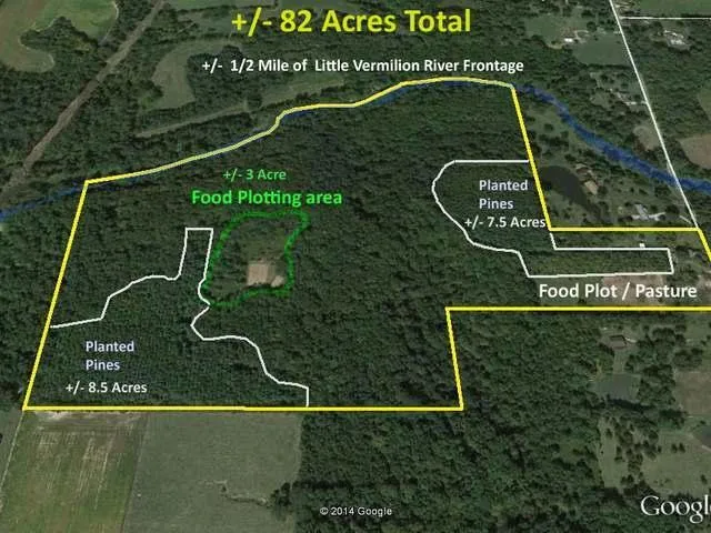 +/- 82 Acres with River Frontage and 3,000 sq ft home Vermilion County, IL Located just east of Georgetown, IL; 45 minutes east of Champaign, IL; 2.5 hours south of downtown Chicago; 1.5 hours west of Indianapolis, IN. +/- 82 acres in total +/- 3000 sq ft, 1.5 story home with 5 bedrooms, 3.5 bath, 2 car attached garage. Home is selling in as is condition. +/- 78 acres, heavily wooded +/- 4 acre pasture and open sided shed for livestock Half mile of Little Vermilion River Frontage +/- 3 acre established food plotting area +/- 16 acres of mature planted pines Internal trail system suitable for ATV's