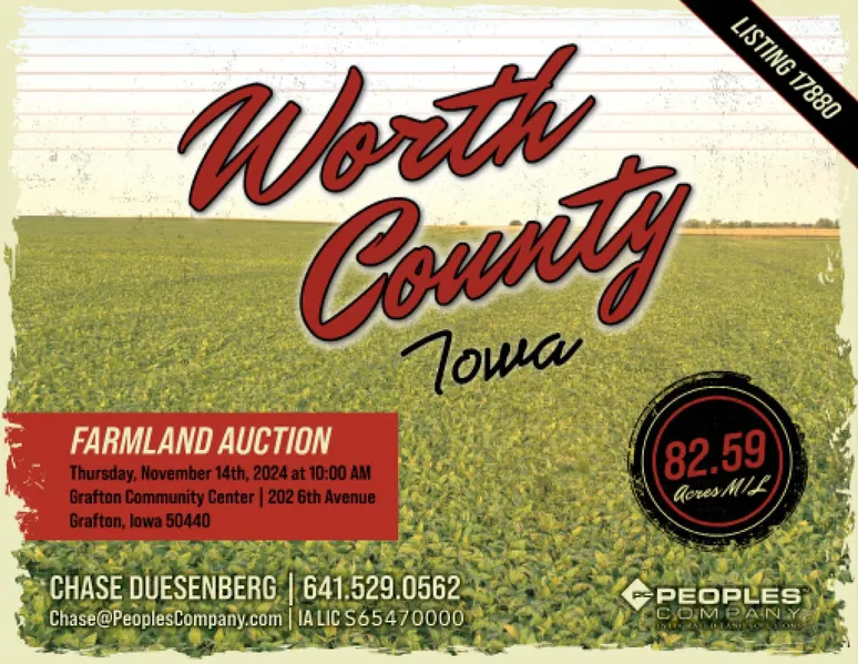 Worth County, Iowa Land Auction Mark your calendar for Thursday, November 14th, 2024! Peoples Company is honored to represent the heirs of the Margaret M. Wimberly Estate in the sale of 82.59 surveyed acres m/l located southwest of Grafton, Iowa. The farmland will be offered via Public Auction as one tract and will take place at 10:00 AM at the Grafton Community Center.