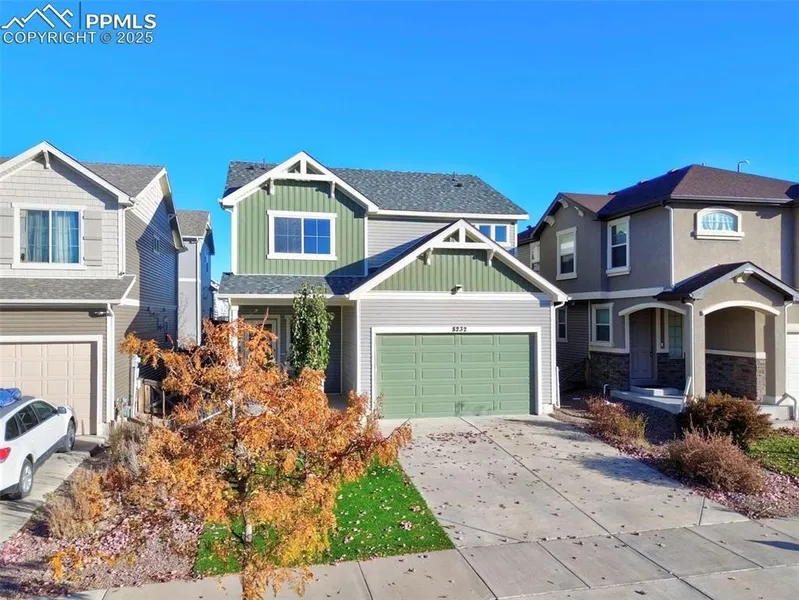 STUNNING 2 STORY with GORGEOUS LANDSCAPING in Banning Lewis. This home captivates you from the moment you walk up to the covered front porch into the open floor plan on the main level. The living, dining, and kitchen area seamlessly flow together with picturesque windows streaming natural light throughout. The area is spacious creating the perfect environment for entertaining. The dining area walks out to an incredible back yard which is partially xeriscaped for low maintenance. Back inside the kitchen features ample cabinet and counter space. The upper level has all three bedrooms including the primary suite. The primary bedroom is spacious and features a walk-in closet and ensuite bath with double vanity and luxurious stand alone shower. Bedrooms two and three are both good sized, have their own walk in closet, and share a full bath. The Banning Lewis Ranch community has amenities galore, including neighborhood schools within walking distance, over 65 acres of parks/trails/open space for hiking/biking, tennis courts, pickleball courts, basketball court, rock climbing, zip-lines, access to pools, splash pad, water park, and dog park. The recreation center houses a fitness center and regularly hosts classes and events for all ages. In the summer months, catch a neighborhood concert, festival, food trucks, farmers market or enjoy other regular community events. This community has it all.