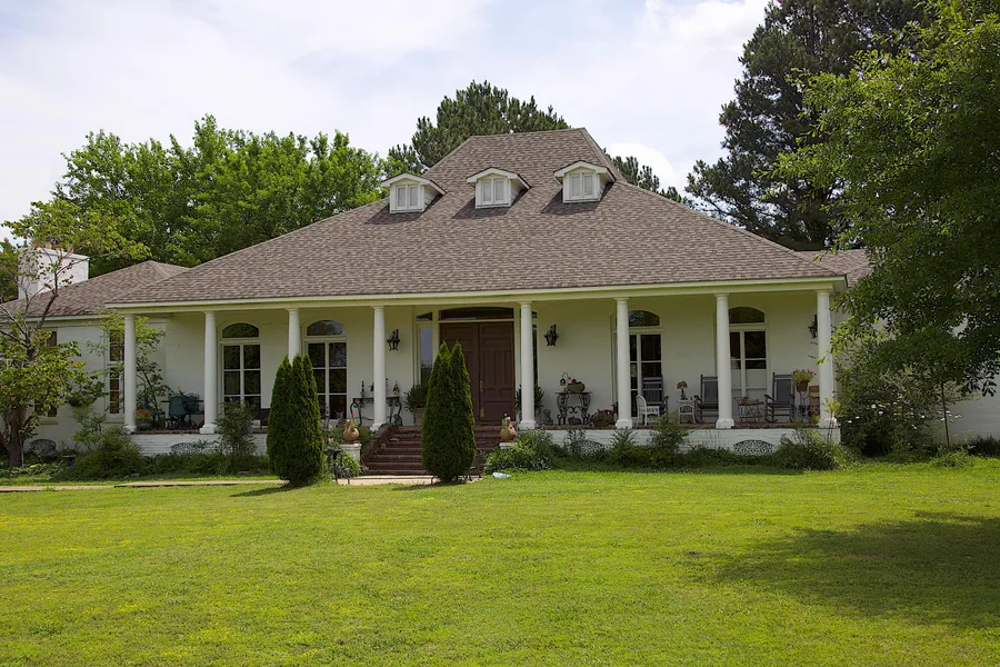 Sassafras House was aptly named after the prolific Sassafras trees that are found in the wooded hillsides nearby. Beausoleil or Beautiful Sun comes from the panoramic sunrises and sunsets that you can enjoy from the sprawling front porch (facing west) and sunroom (facing east). Sassafras House was strategically oriented so you can also enjoy these views from most rooms in the home. The design of the home was inspired by Destrehan Plantation in Southern Louisiana (circa 1787). Construction started on Sassafras in 1993. The home is a delightful mix of reclaimed historical materials and classic designer finishes. During construction, the owner purchased Heart Pine beams from a Rice Mill in Forrest City, Arkansas and had the wood custom milled into flooring, millwork, and beams for the home. The rich tones of this reclaimed Heart Pine give Sassafras a warm and inviting sense of place. There is a mammoth fireplace in the living room faced with antique fire brick and a hearth made of reclaimed stone from a local antebellum log cabin.