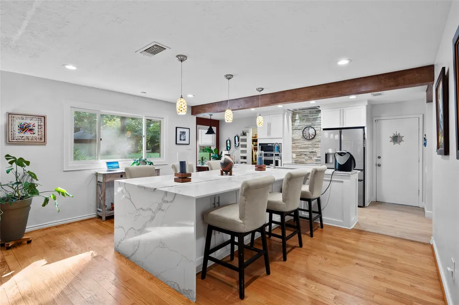 Welcome to your dream home nestled on a serene cul-de-sac in the highly desirable Grogan's Mill neighborhood! This stunning passive solar custom home was thoughtfully designed by a UT Professor of Architecture. As you approach, you'll be greeted by a charming covered front porch leading to a spacious interior filled with natural light. The heart of the home is the spacious kitchen, with unique massive quartz island, induction cooktop, a chic coffee bar & bright breakfast nook. The den includes a gas fireplace, built-in shelving, a wet bar, and striking wood beam ceilings, Hardwood floors that add character and charm. Primary retreat is located on the main floor, providing a serene sanctuary, upstairs you'll find two additional bedrooms, balconies and study. Outside is the beautifully crafted wood deck, with built-in seating, surrounded by mature trees and a lush greenbelt with no rear neighbors for maximum privacy. Full house generator and close proximity to The Woodland's mall.