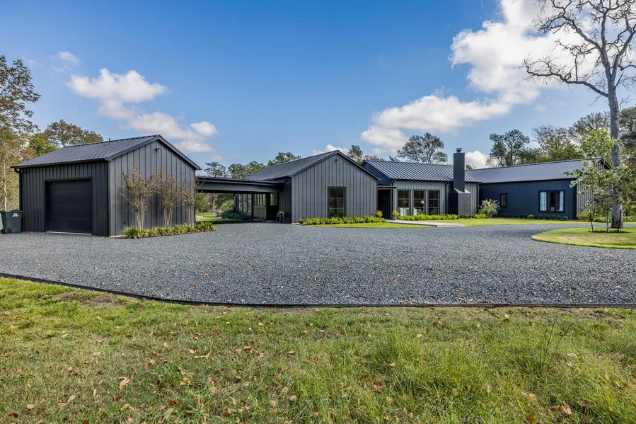 Tucked away minutes from Round Top, is a 15.57 acre private paradise, where a winding driveway leads to a captivating newly built modern farmhouse. Custom steel doors front this exceptional residence and walls of windows allow for rich, natural light to flow throughout the home. The Dining Wing provides a harmonious setting for both intimate family gatherings and grand-scale entertaining. The expansive living area is elegant yet invitingly comfortable with the fireplace a cozy focal point. A separate wing with 4 en-suite bedrooms includes the primary bedroom with views of the pool and a walk-in closet. The backyard haven creates an oasis of tranquility with a sparkling pool, flex room, firepit and pickleball court. This luxurious property is being offered turnkey and all within minutes of Round Top!