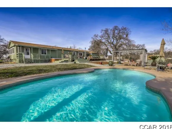 Enter the usable 5 acres through the private electric gate. Enjoy sunsets from the covered front porch. Open Floor plan with Living room , dining room, Kitchen is open to Family room that has several large windows that over look the built in pool. Cozy wood stove . Kitchen has white cabinets with granite counters & Island , Stainless appliances, walk in pantry. 4 bd, 3 Full baths. Darling Veranda with FIR Sauna, just off the Master bedroom, door leads to Spa .Master bath has spa jet tub, New tile shower. 20x50 composite deck has hot -tub , over looks the built in swimming pool. Additional 12x24 detached Guest bedroom/Office with bath. Outside has plenty of area's to entertain, Koi Pond, raised beds. 12x20 Barn with loft. Garage has additional Carport for extra covered parking.