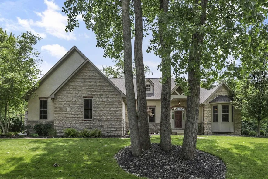 This custom-built ranch sits on 1.41 wooded acres and offers the rare mix of privacy, craftsmanship, and location. With over 4,100 square feet of finished space and no HOA, the home is designed for those who value comfort, style, and flexibility. Inside, a large great room with vaulted ceilings and a floor-to-ceiling stone fireplace sets the tone. The open kitchen features granite counters, high-end appliances, and flows into multiple dining spaces that work for both everyday meals and larger gatherings. The first-floor primary suite includes a spacious bath with a whirlpool tub and walk-in closet. Three additional bedrooms and 3.5 total bathrooms offer room for family or guests. A private office with natural light adds to the home's functionality. The finished lower level adds even more living space with a home gym, a recreation room, four full-size windows, and rough-in plumbing for a future bath. Whether you need space to entertain, relax, or expand, it's ready for your vision. A screened porch offers wooded views and quiet outdoor living. The exterior blends stone and stucco in a French country style, and the three-car side-load garage keeps the front elevation clean while offering ample storage. Located in the Olentangy School District and just minutes from downtown Powell, top-tier shopping, and Kinsale and Scioto Reserve Country Clubs, this one-owner home is a rare find in a sought-after area.