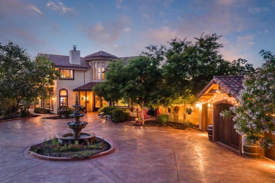 PENDING! Fall for this 61-acre Sierra Foothill vineyard estate; situated privately above an award-winning vineyard and boasting extraordinary lake and mountain views, this home was designed to capture an abundance of natural light, with floor-to ceiling windows and doors allowing for the enjoyment of expansive views. This estate is, in and of itself, a destination offering an entertainers kitchen with top-of-the-line appliances, home theater, numerous balconies, expansive pool, hillside spa, and enchanting courtyards. An elaborate spiral staircase is the center of the home, adorned with bespoke iron handrails. The property consists of a main home, cabana, winemakers home, guest home and 11-acres of planted grapes, and wine inventory. Its easy to perfect the art of living, when you live within a work of art.