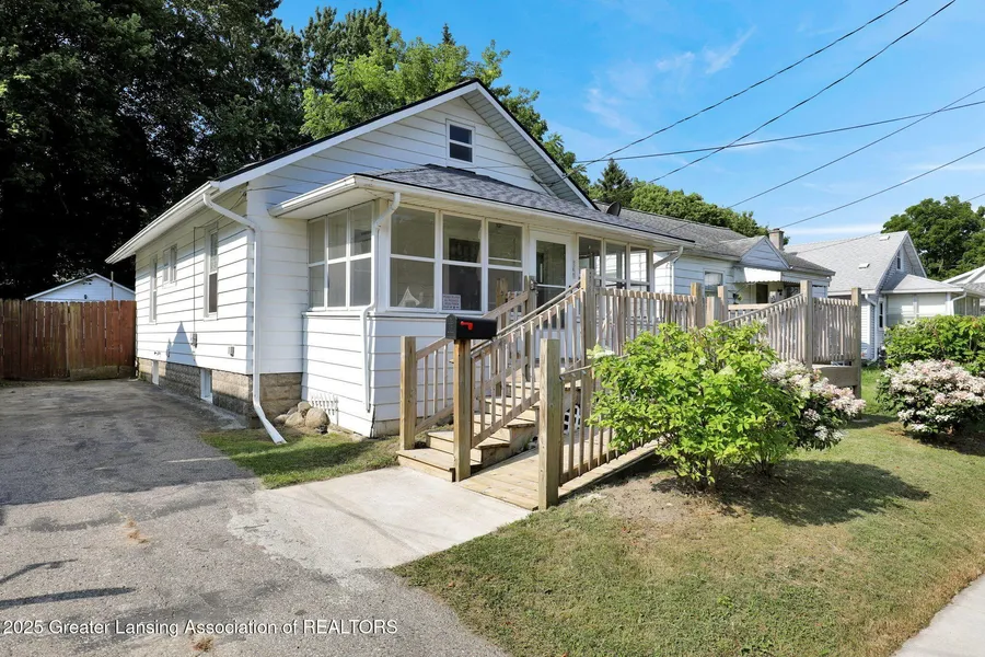 Darling bungalow style home with enclosed front porch, newer roof & furnace, hardwood flooring, and accessible ramp is ready for immediate occupancy! Living room provides natural woodwork, newer ceiling fan, & archway opening up to formal dining area with built-ins. Kitchen offers updated stainless steel refrigerator, and oak cabinets. Two minor bedrooms feature hardwood flooring, ceiling fans, and closets. Both are serviced by fully remodeled bathroom with heated tile flooring, newer vanity & shower insert. Upstairs is ready to be finished & add to your equity with more livable space. Fully fenced backyard with spacious deck, and bonus storage shed with concrete flooring. Additional highlights: 2017 Furnace, Central Air, 2018 Roof with 50 year transferrable warranty. Entire first floor was just freshly painted 7/2025- don't miss out on this opportunity for a home in a great location with updated mechanicals at a wonderful price!
